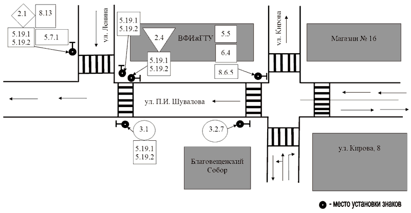 Утвердить установку знаков дорожного движения – 2.1 «Главная дорога», 2.4 «Уступите дорогу», 3.1 «Въезд запрещен», 3.27 «Остановка запрещена», 5.5 «Дорога с односторонним движением», 5.7.1 «Выезд на дорогу с односторонним движением», 5.19.1, 5.19.2 «Пешеходный переход», 6.4 «Место стоянки», 8.6.5 «Способ постановки транспортного средства на стоянку» согласно приложению.